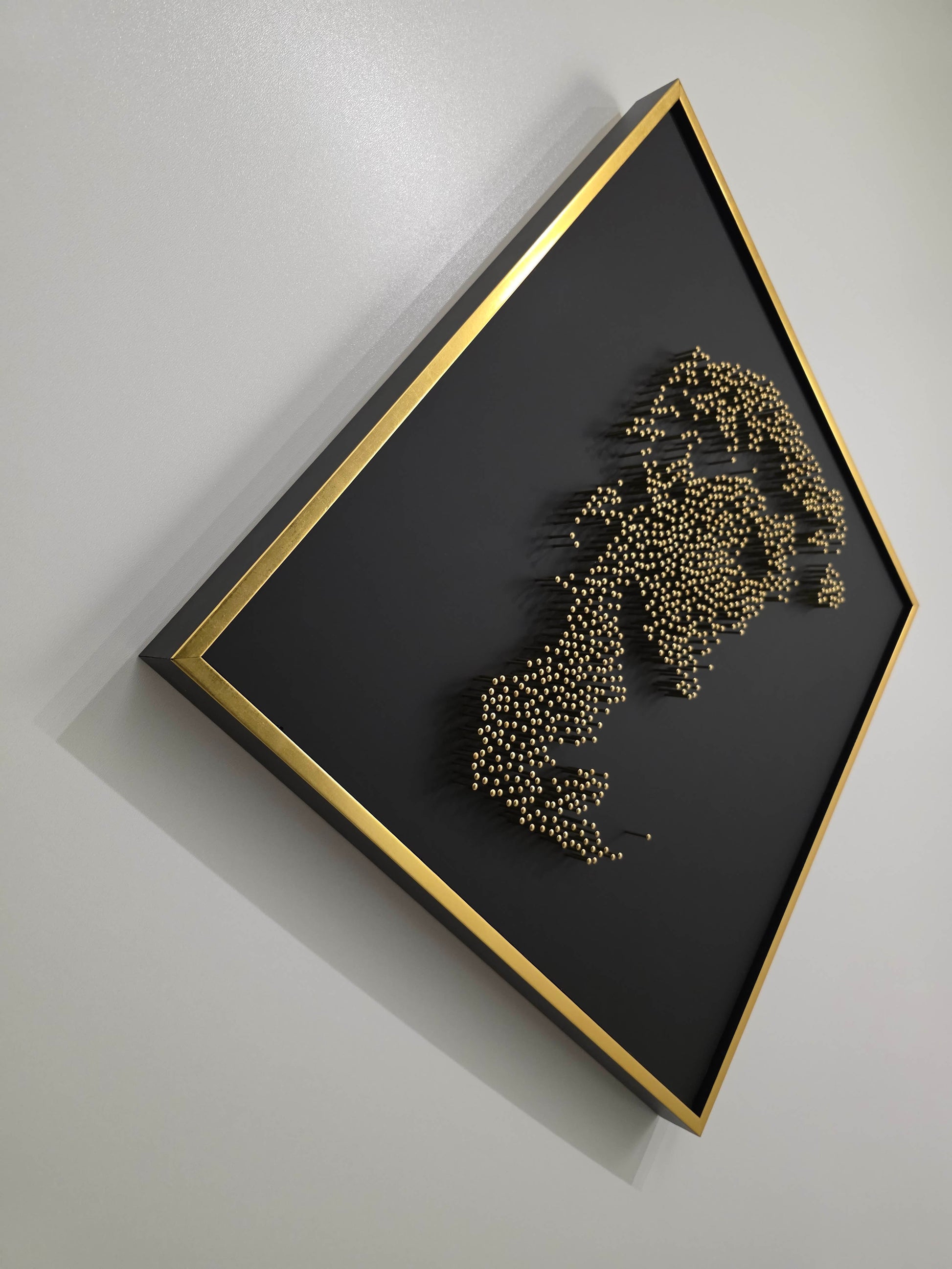 Framed in a matte black wooden float frame with gold-accented edges, A Thousand Nails into the Light of David invites reflection. It’s not an imitation of marble, but a reinterpretation in metal — where strength is drawn not from volume, but from contrast and restraint.