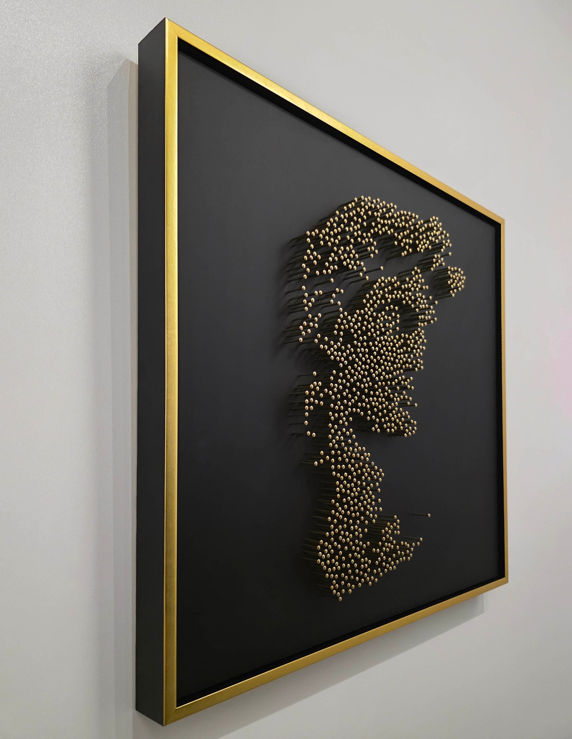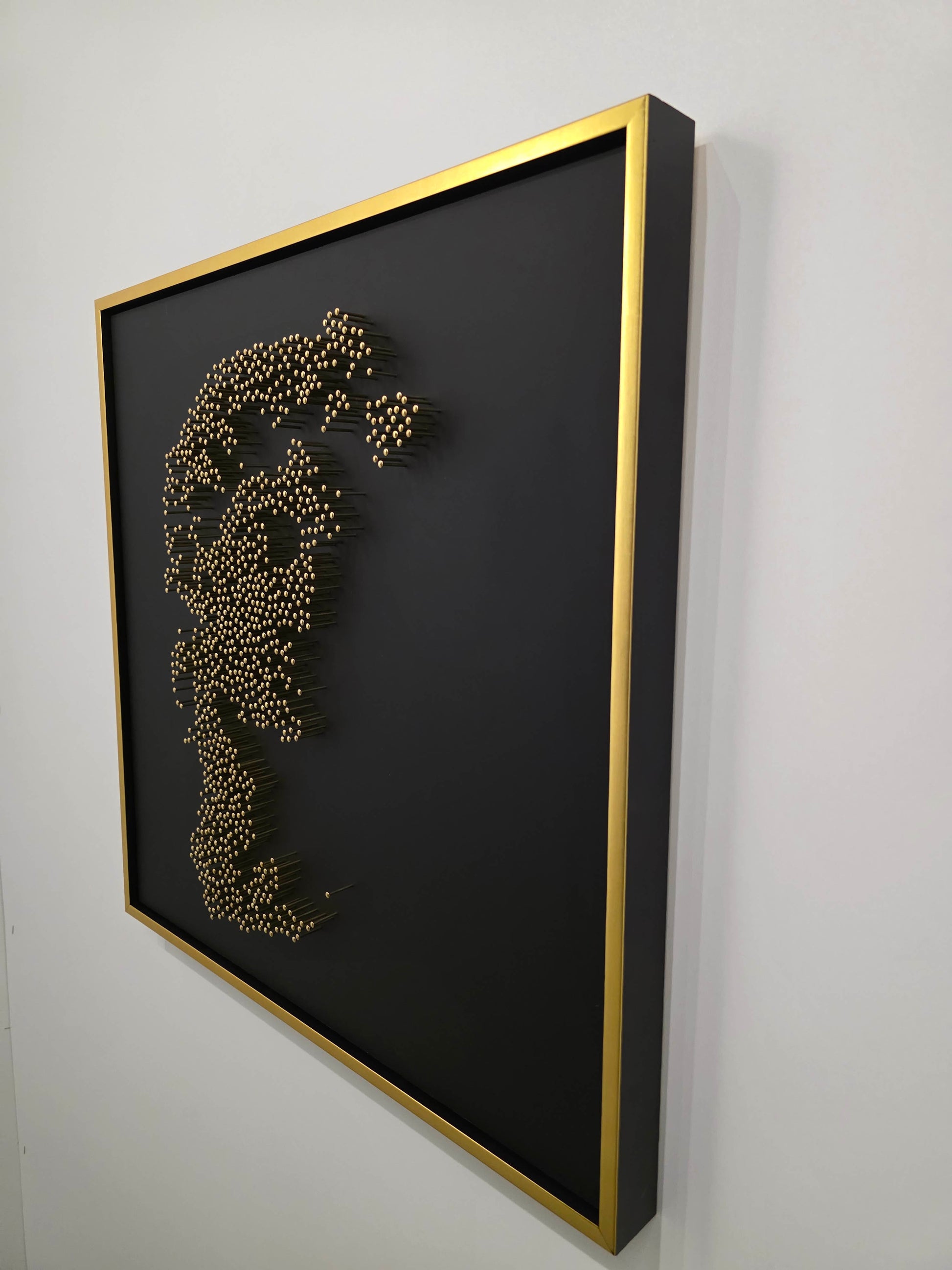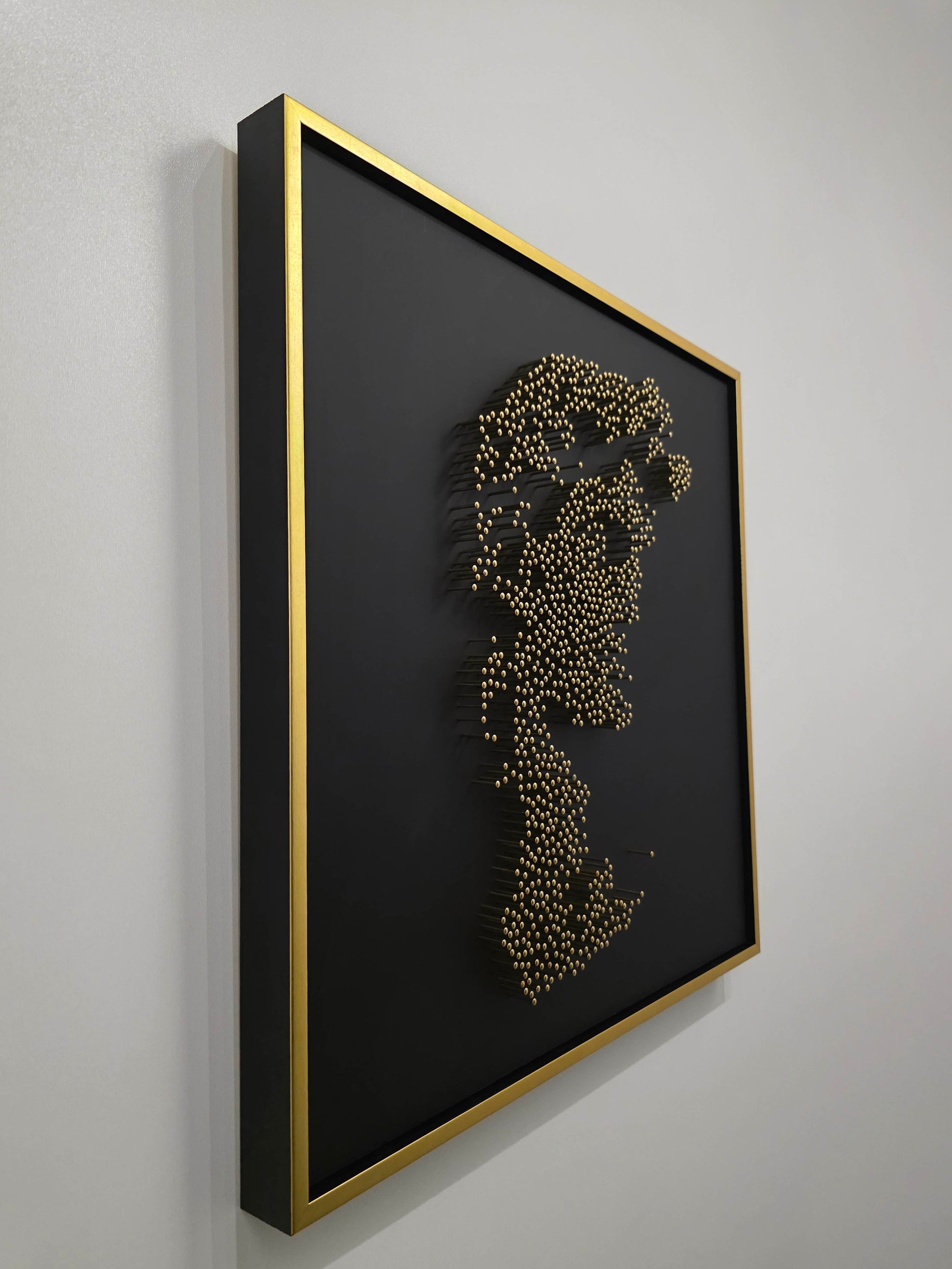 This portrait is constructed entirely without paint or print. From a distance, the classical face emerges with quiet intensity. Up close, the image dissolves into abstraction — raw, rhythmic, almost chaotic — each nail reflecting a sliver of light across matte black acrylic glass.