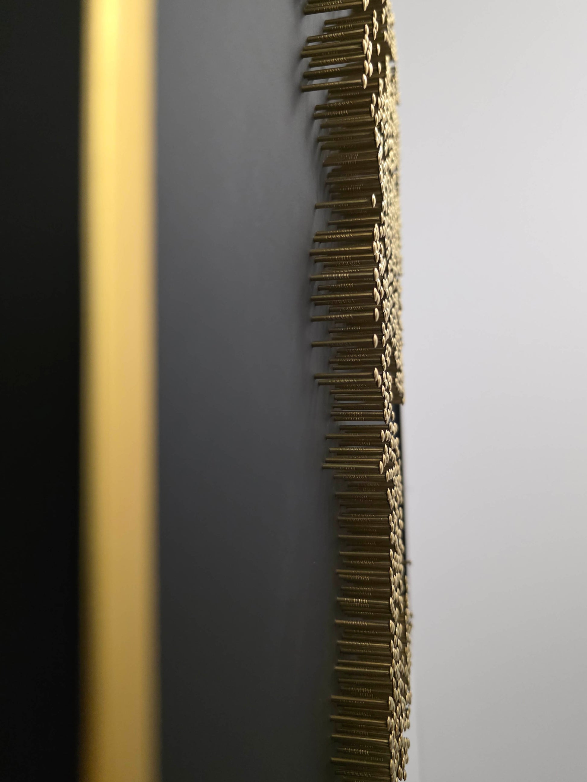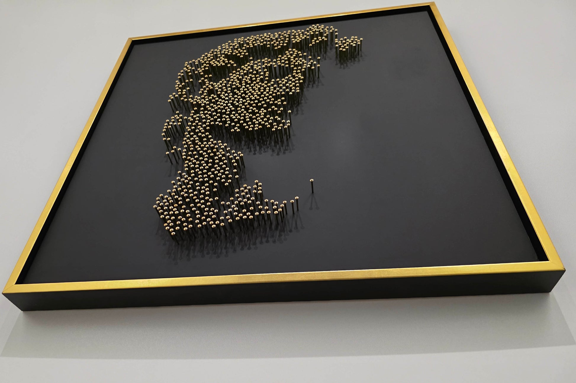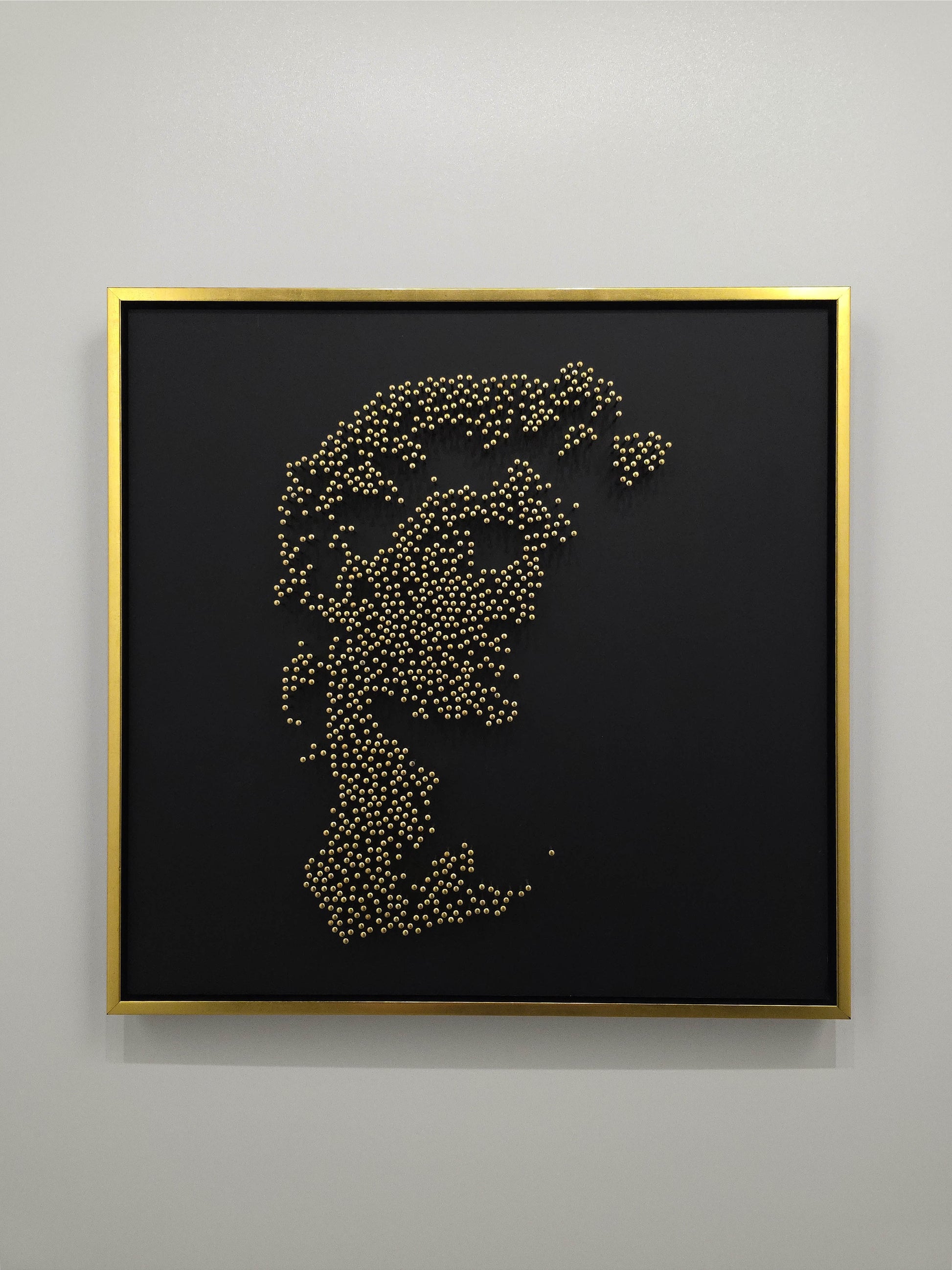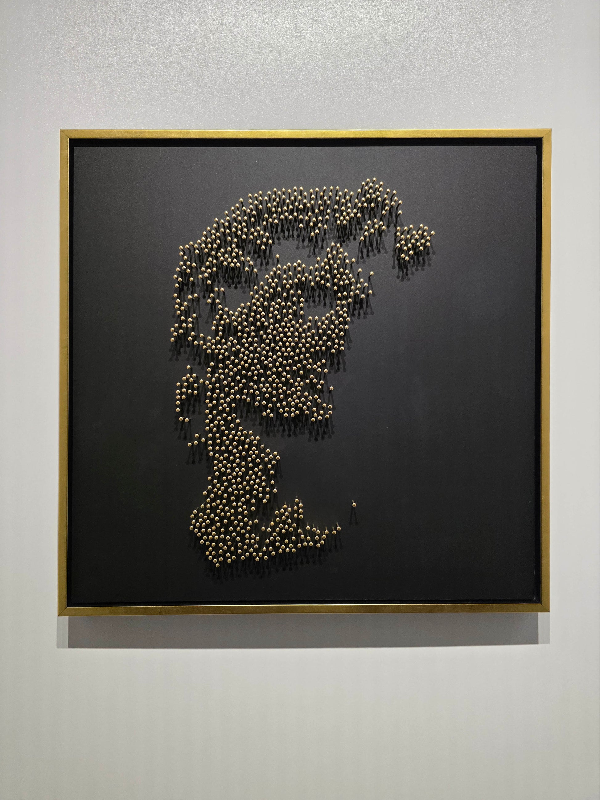 This portrait is constructed entirely without paint or print. From a distance, the classical face emerges with quiet intensity. Up close, the image dissolves into abstraction — raw, rhythmic, almost chaotic — each nail reflecting a sliver of light across matte black acrylic glass.