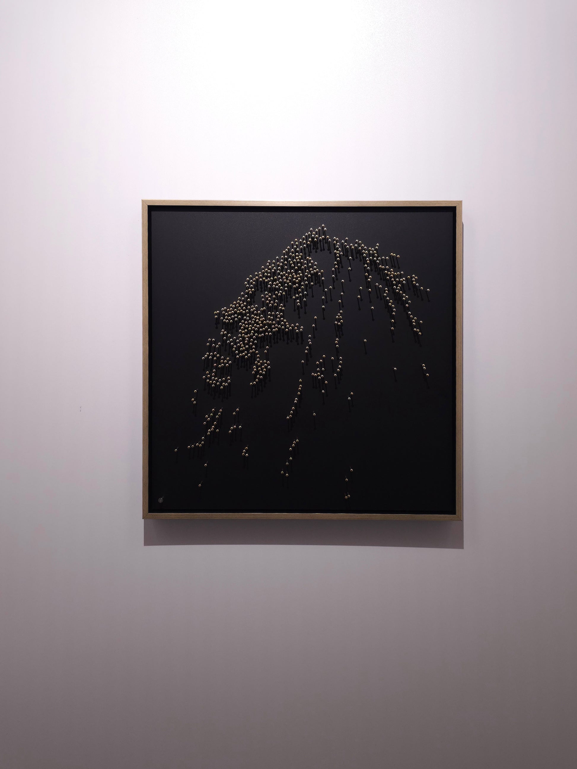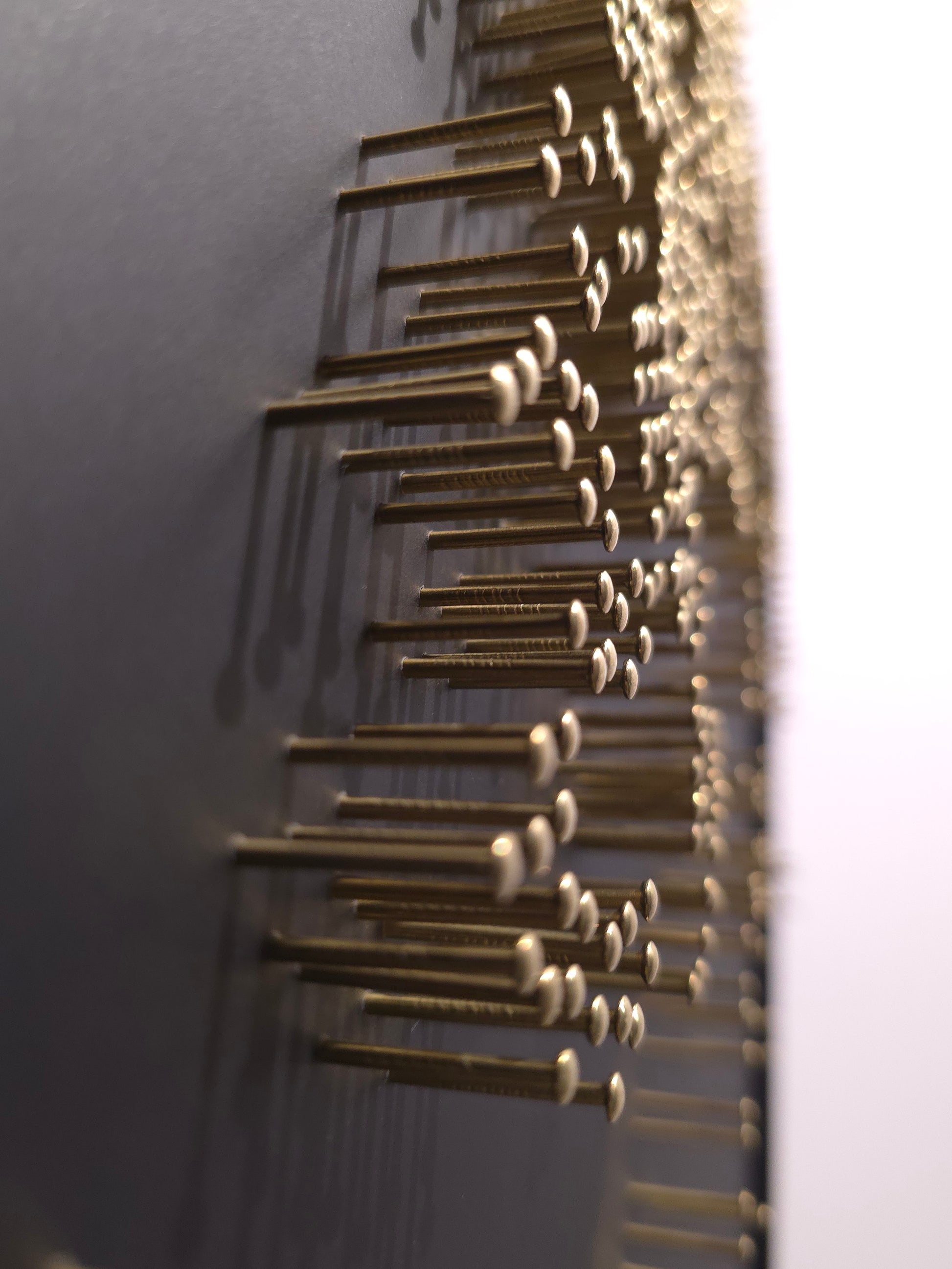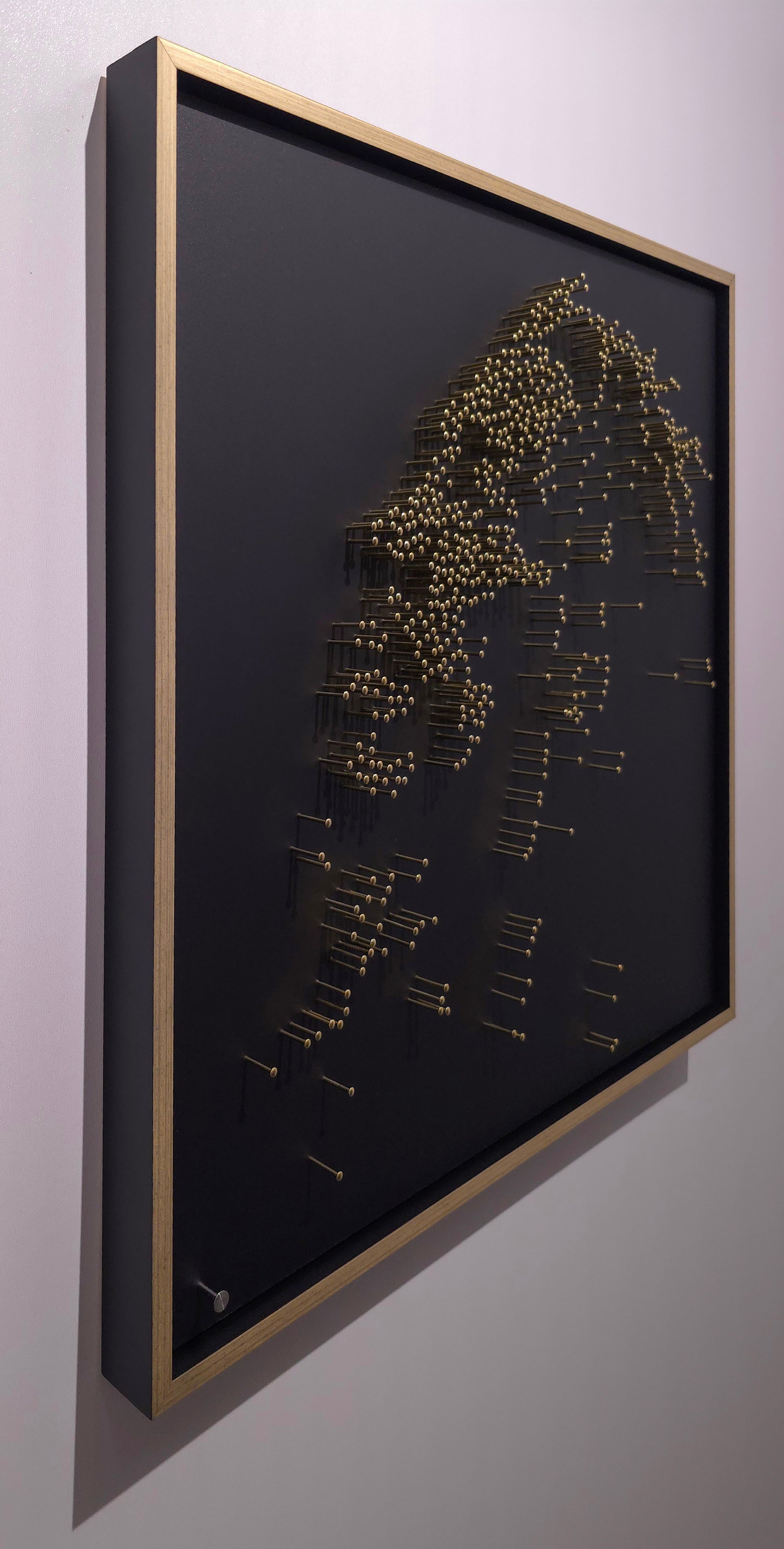 No paint, no print, no ink. His presence appears purely through structure, shadow and reflection. From afar his face radiates calm and strength. Up close the image dissolves into abstraction, each brass nail reflecting light against the deep matte black of acrylic glass.