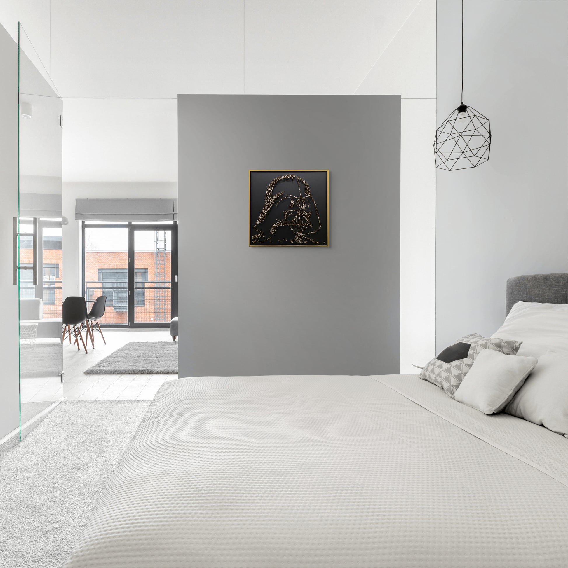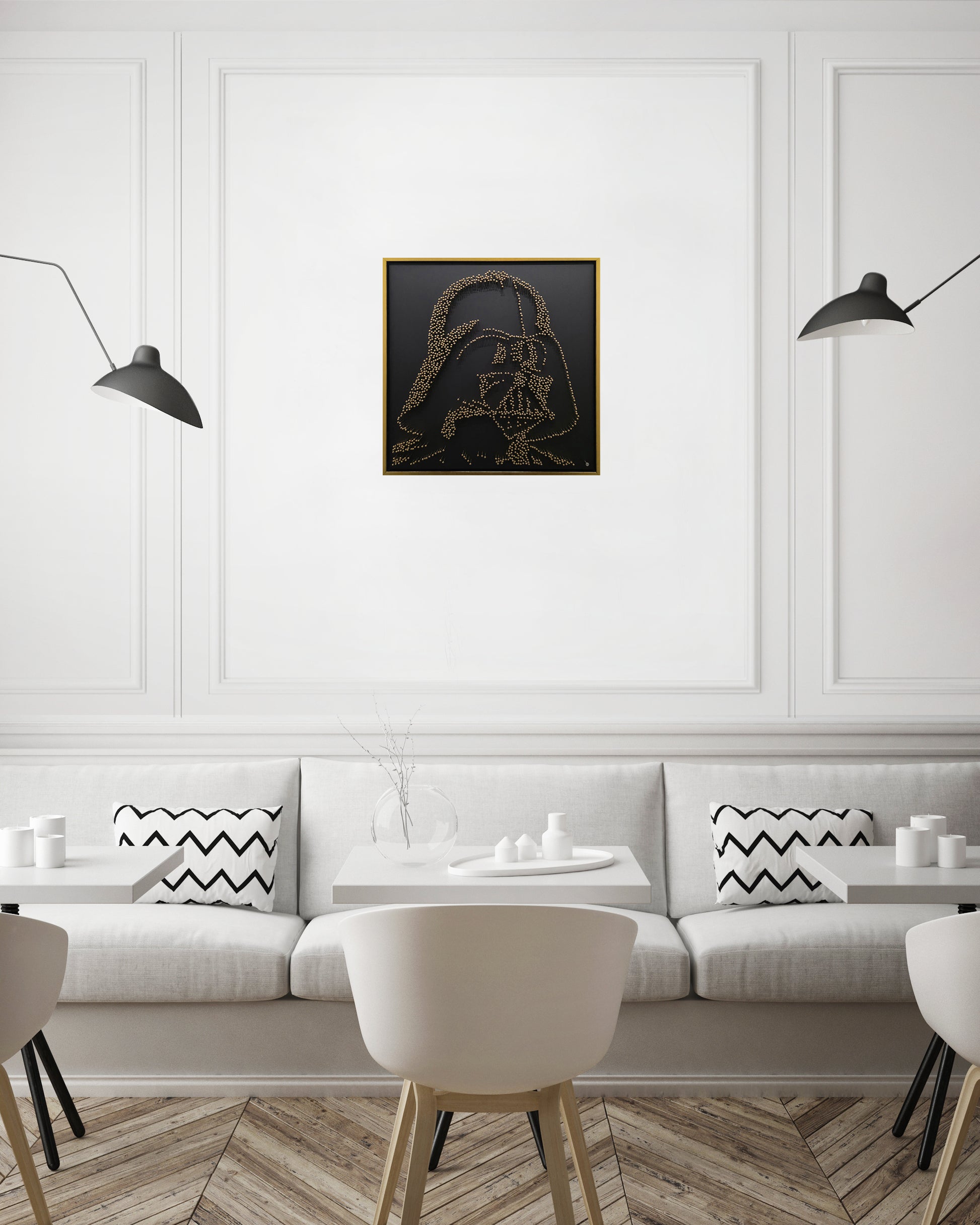 No paint, ink, or print, the unmistakable presence of Darth Vader emerges purely through structure, shadow, and shine. From a distance, the silhouette is instantly recognizable. Up close, it dissolves into a golden rhythm, each nail reflecting light against a deep matte black acrylic background.