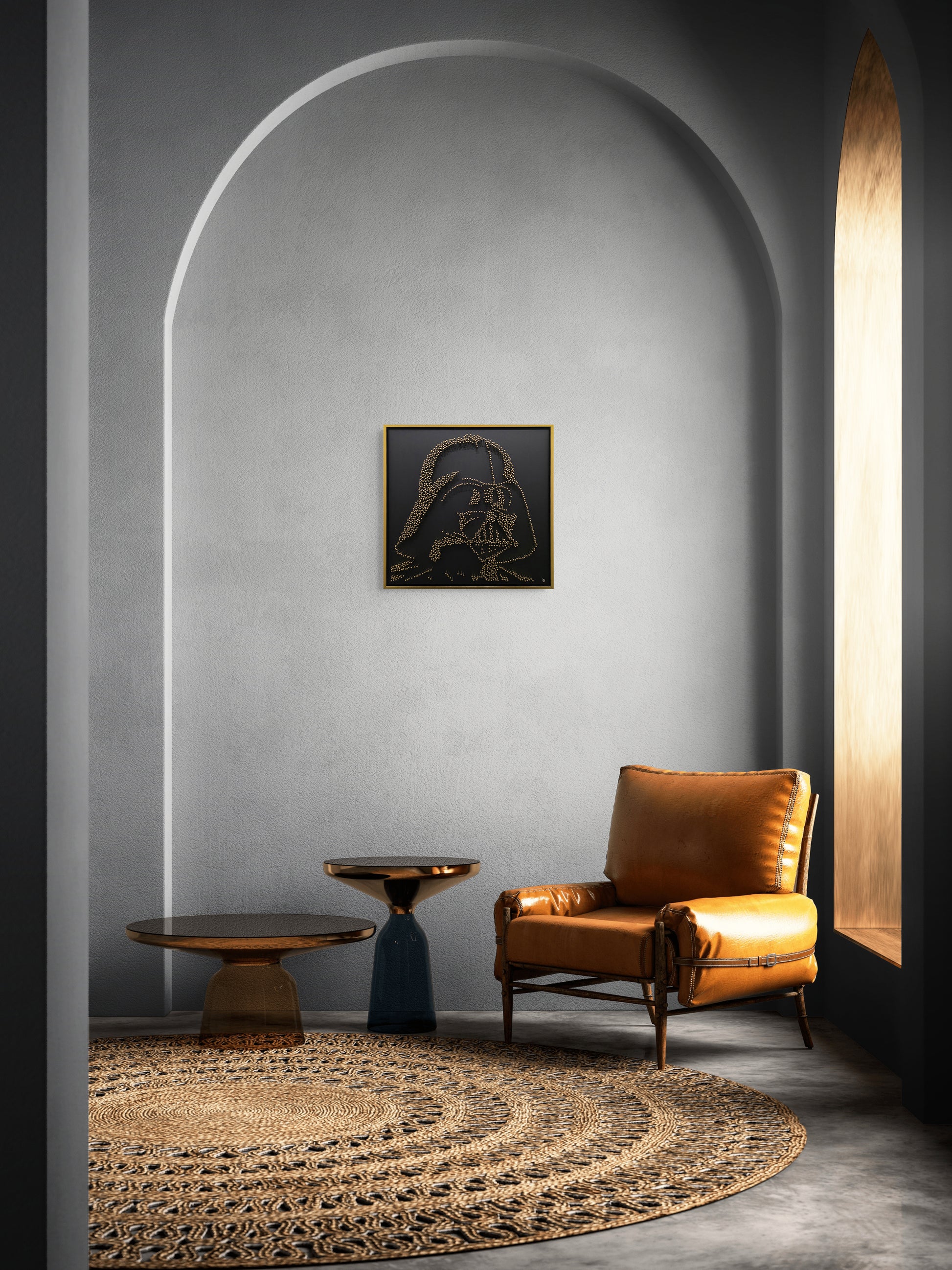 Solid brass meets fragile acrylic glass, a combination of strength and fragility that echoes the duality of Vader himself.