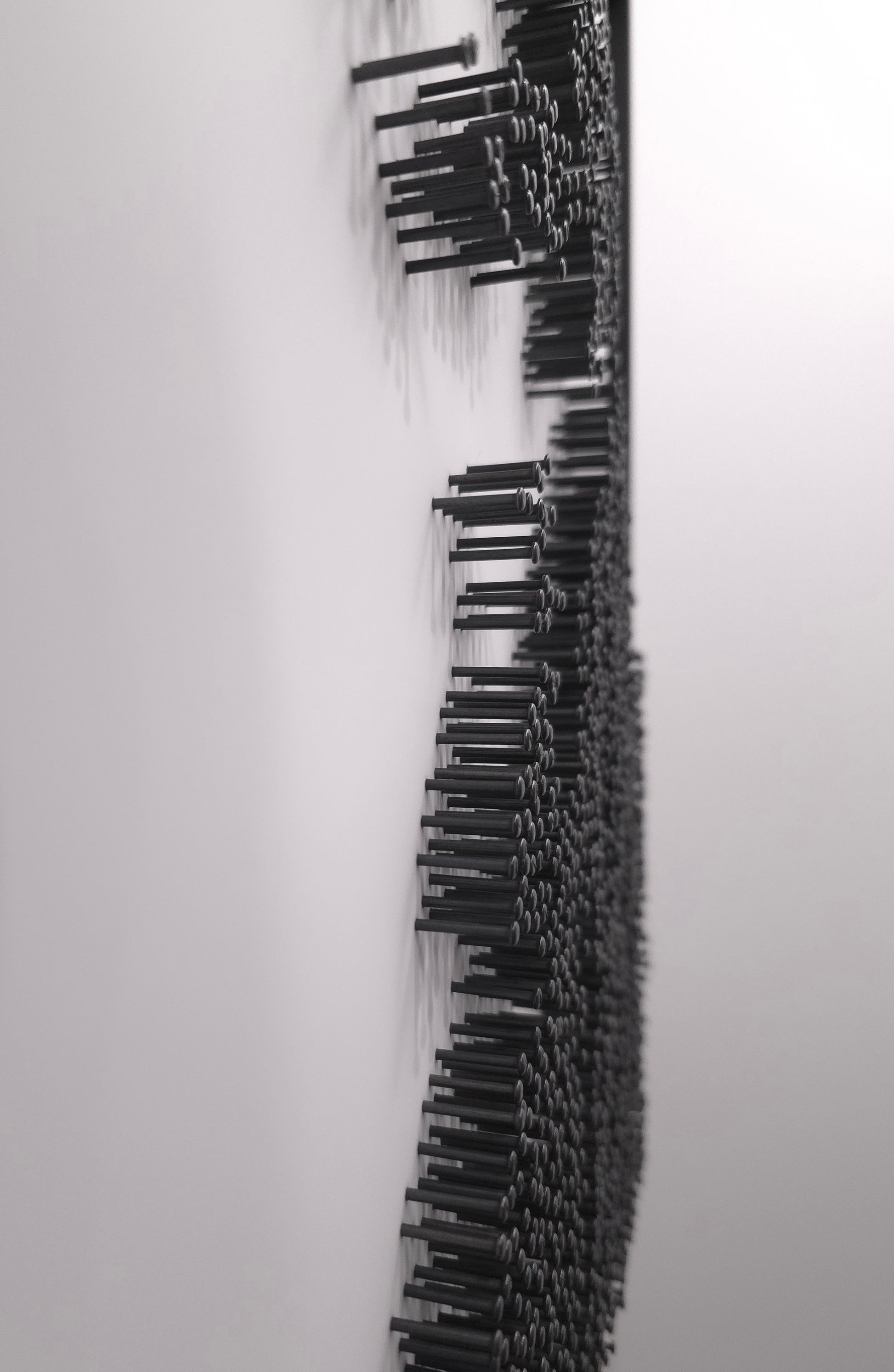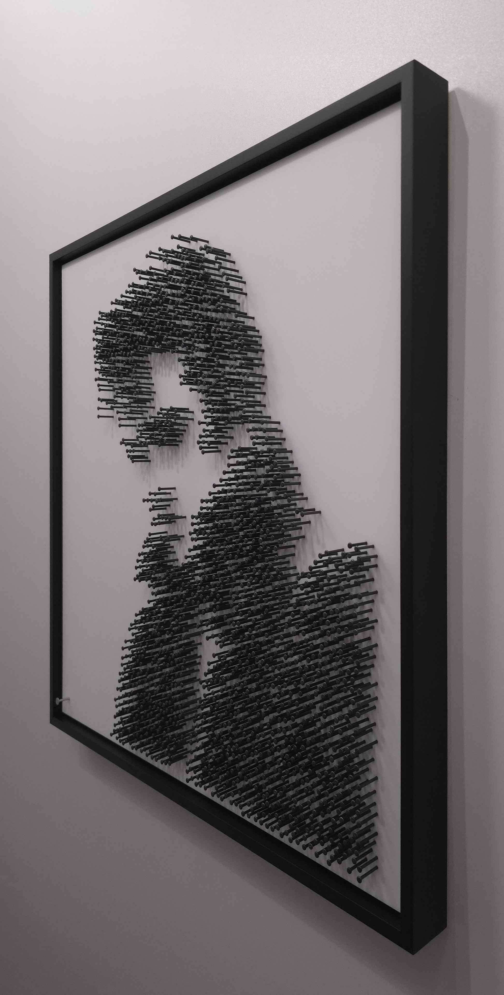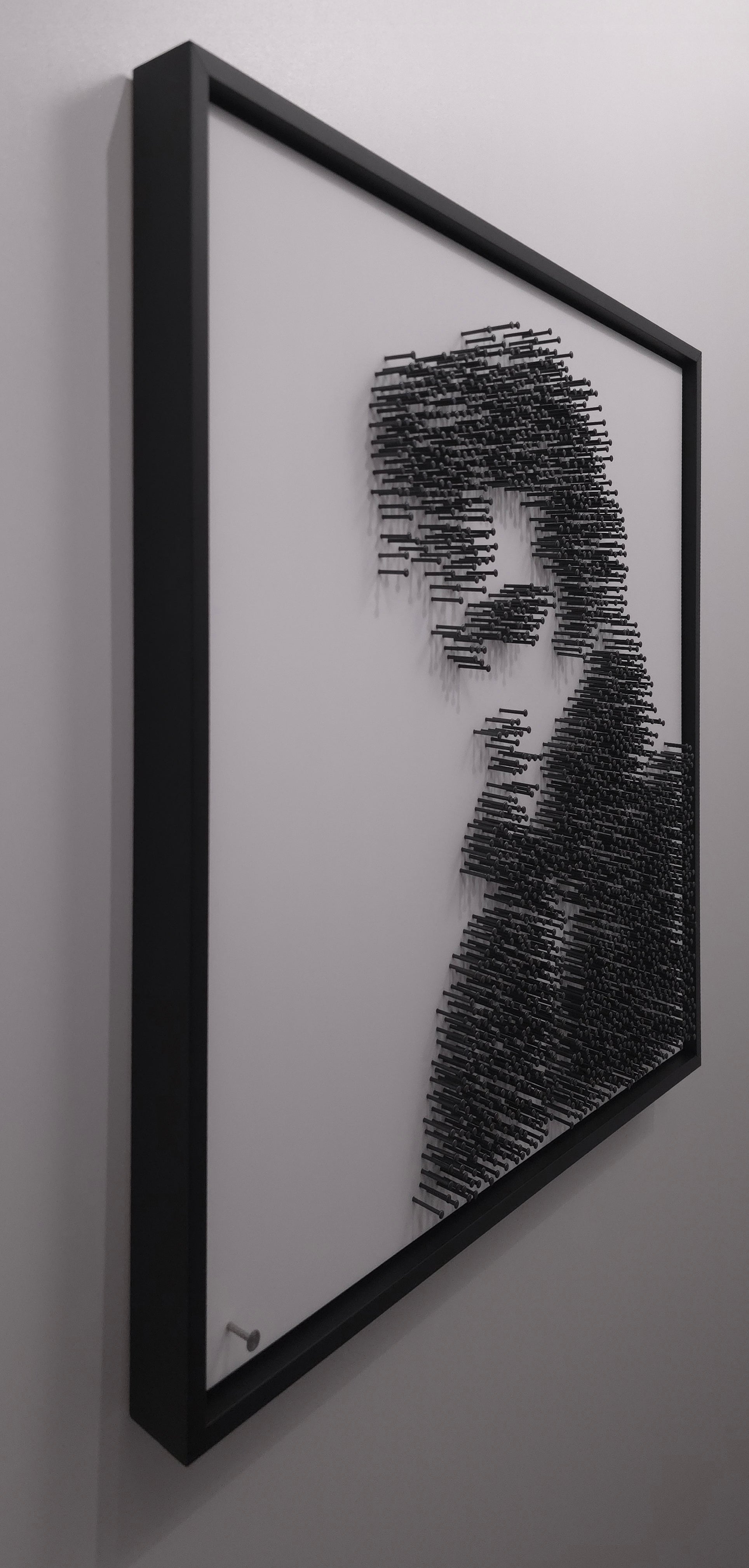 No paint, no print, no ink. His image appears purely through structure, shadow and rhythm. From afar the King emerges with unmistakable power and style. Up close the work dissolves into abstraction, each blackened steel nail forming a rhythm of light and texture, echoing the pulse of his music.