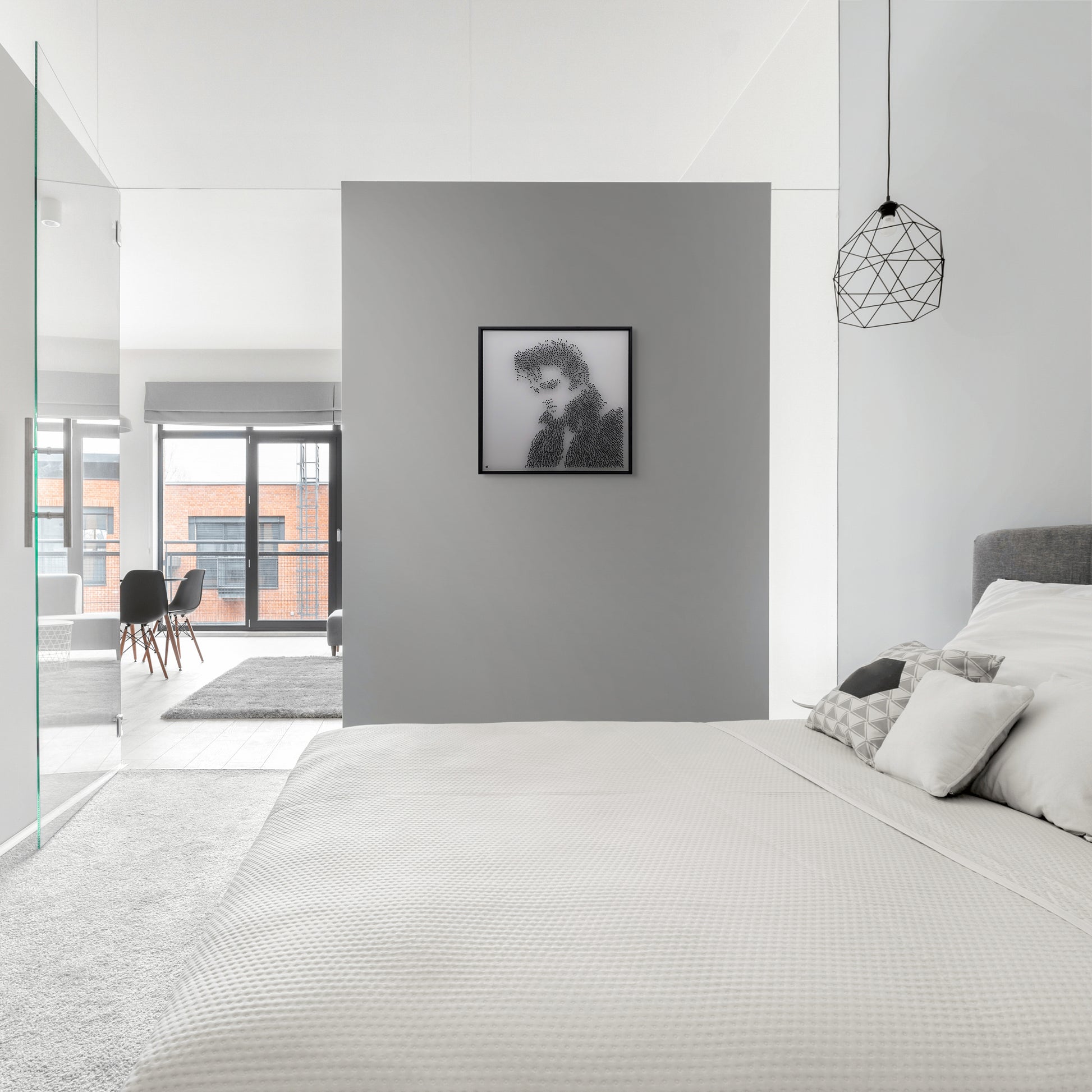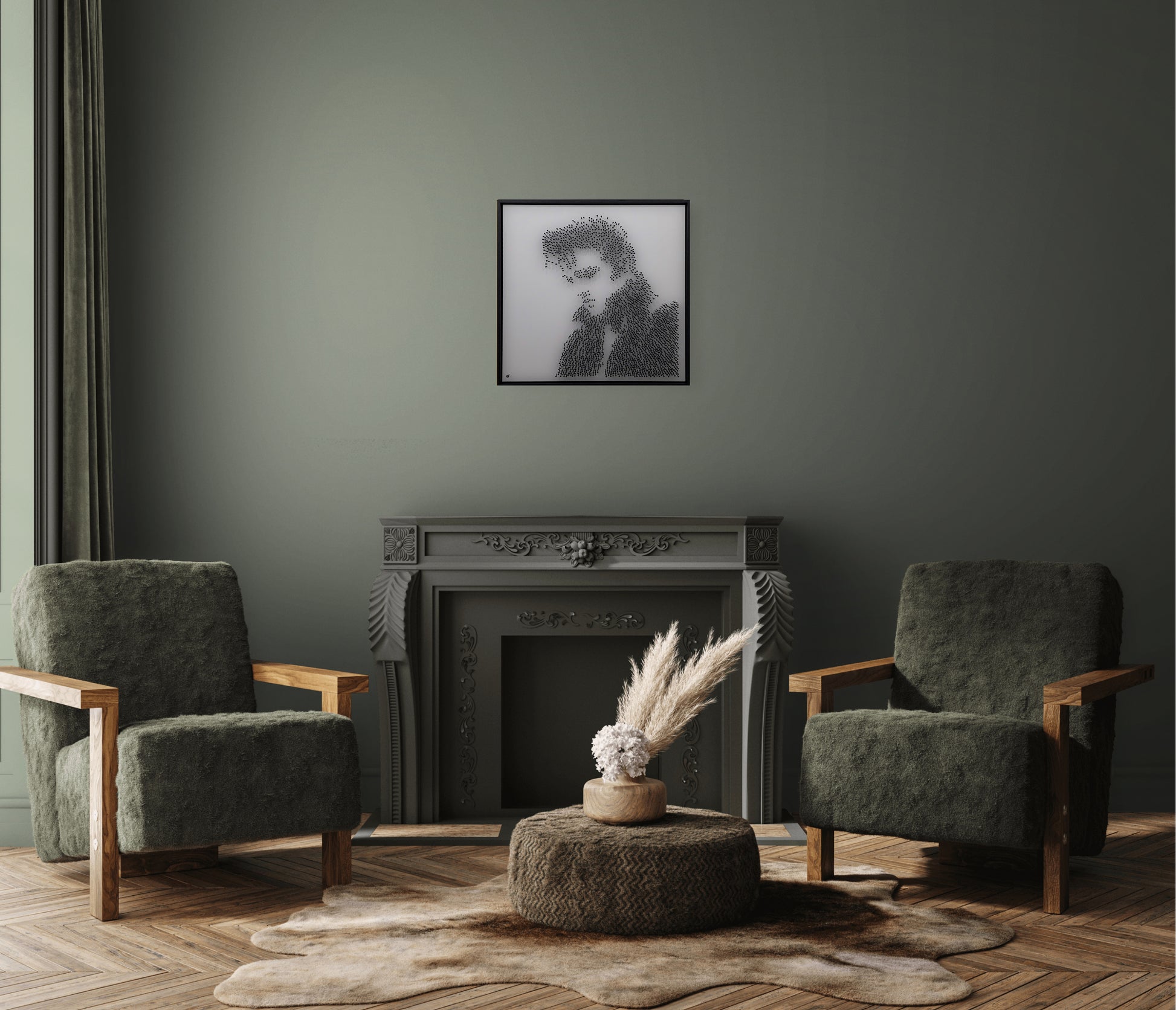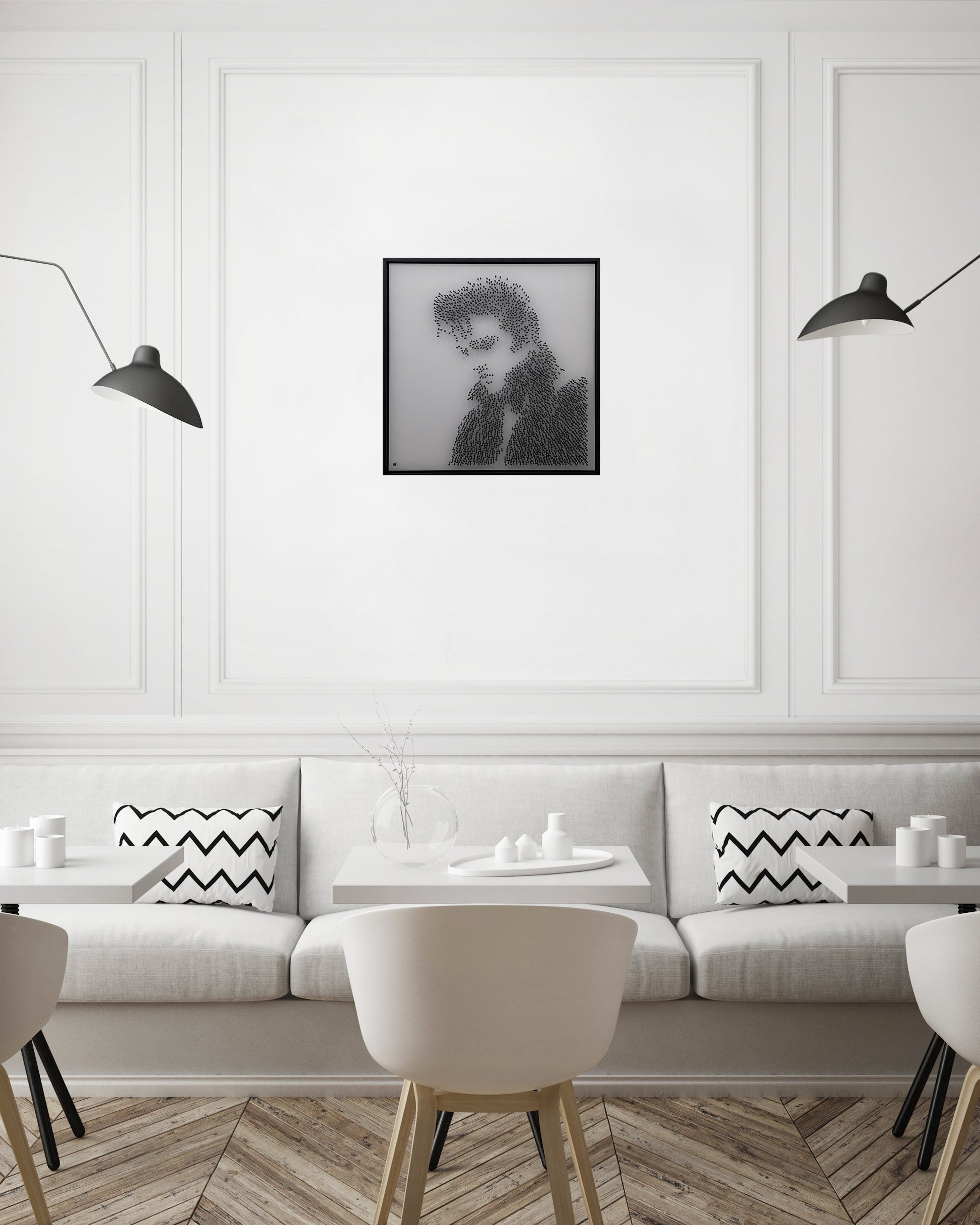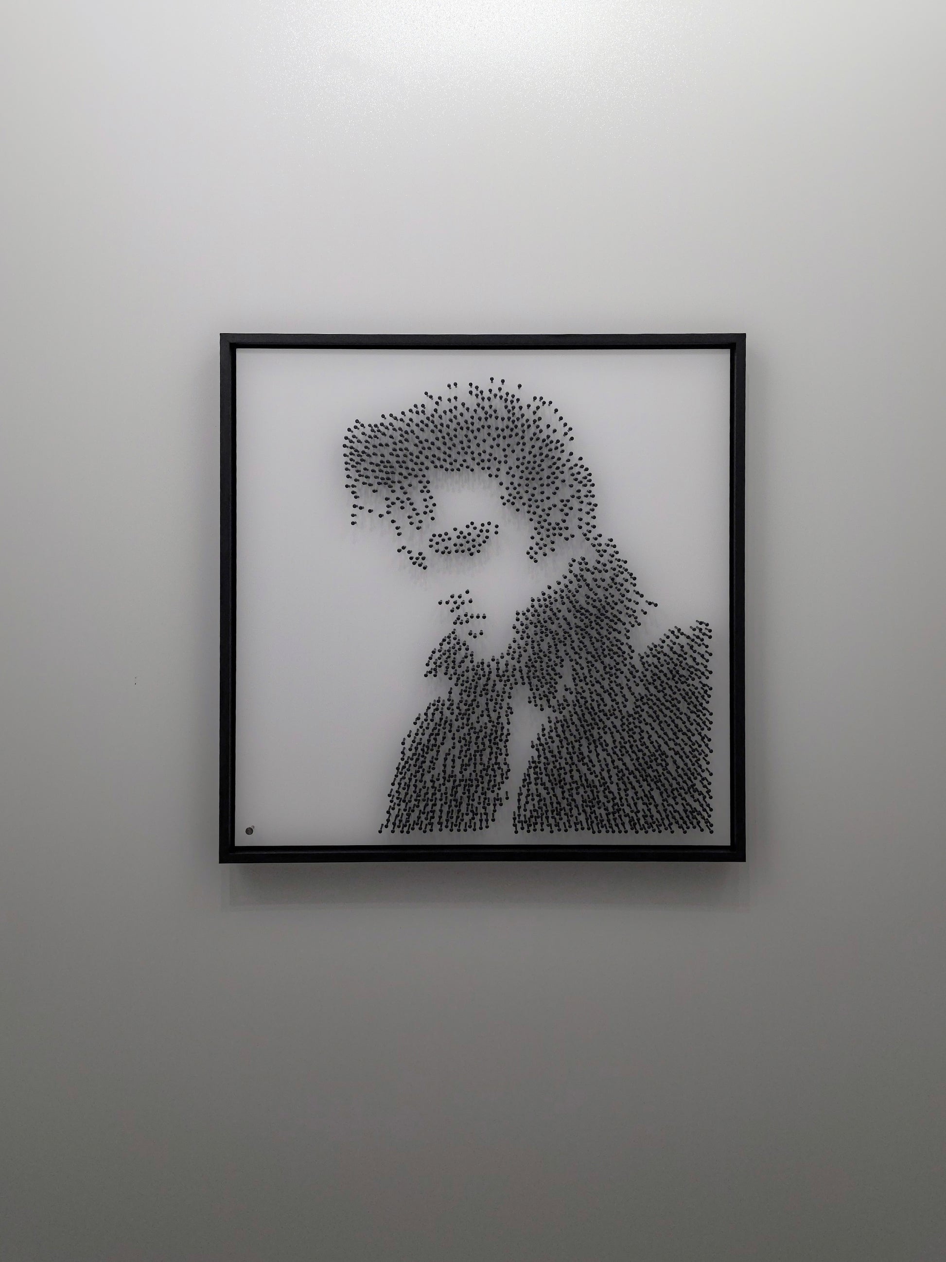 No paint, no print, no ink. His image appears purely through structure, shadow and rhythm. From afar the King emerges with unmistakable power and style. Up close the work dissolves into abstraction, each blackened steel nail forming a rhythm of light and texture, echoing the pulse of his music.