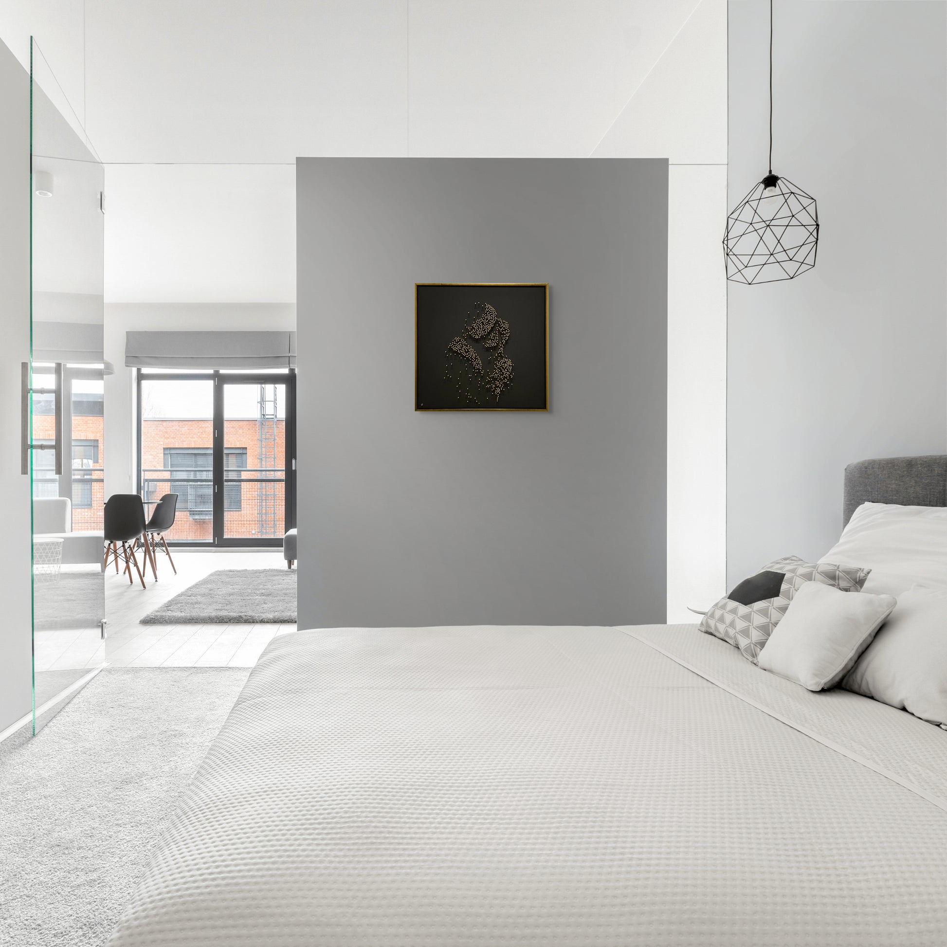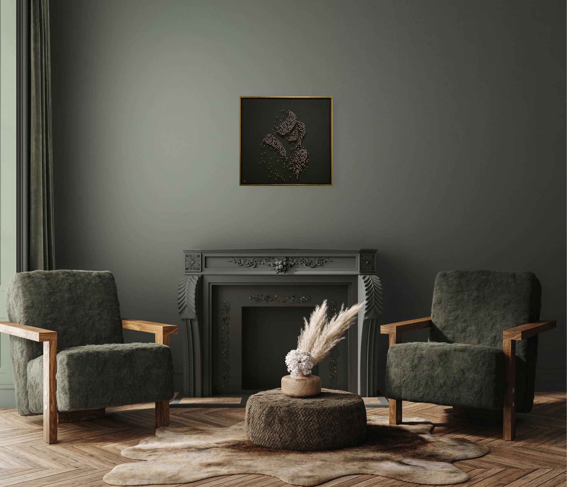Framed in a handmade Dutch float frame in matte black wood with a brushed gold edge, and signed and numbered on the reverse, this work offers a contemporary ode to eternal love.