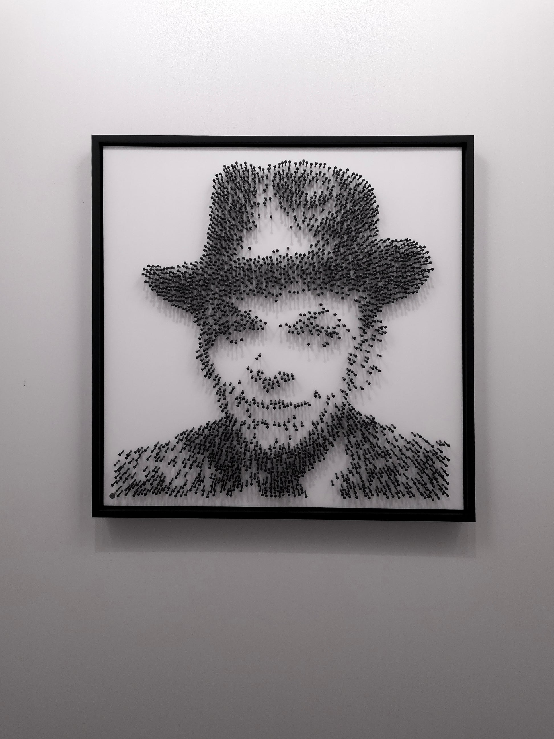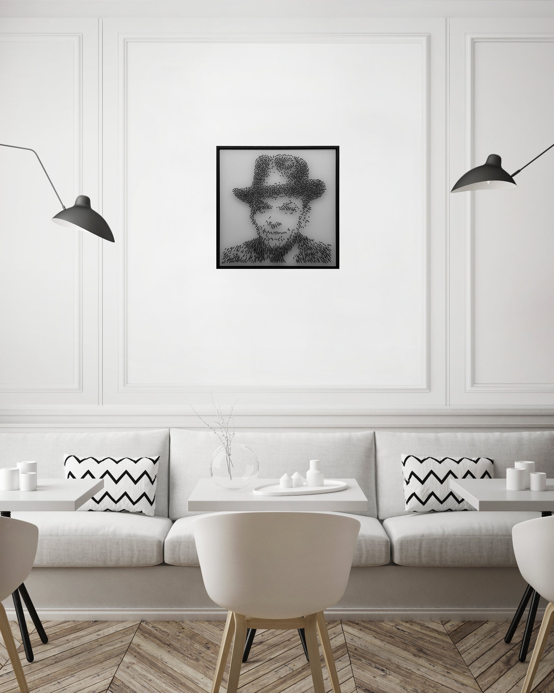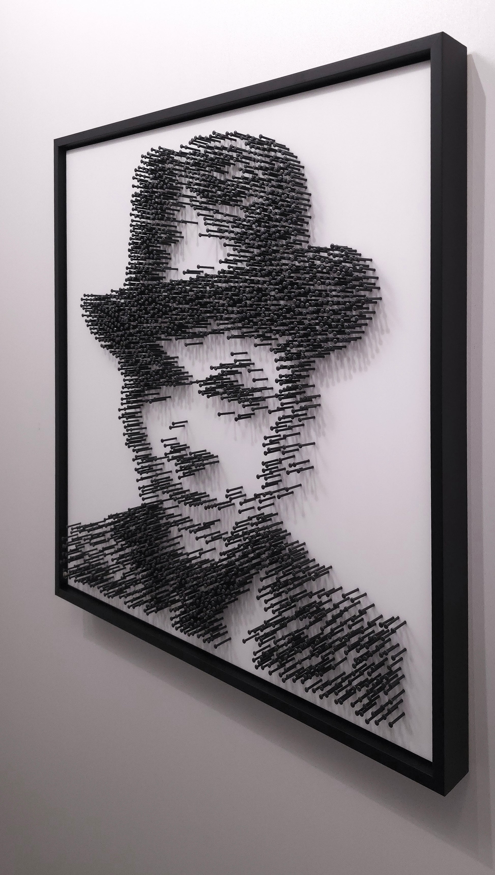 No paint, no print, no ink. His image emerges purely through structure, shadow and rhythm. From a distance the presence is unmistakable, smooth and commanding. Up close the work dissolves into abstraction, each blackened steel nail forming part of a sculptural harmony between light and form.