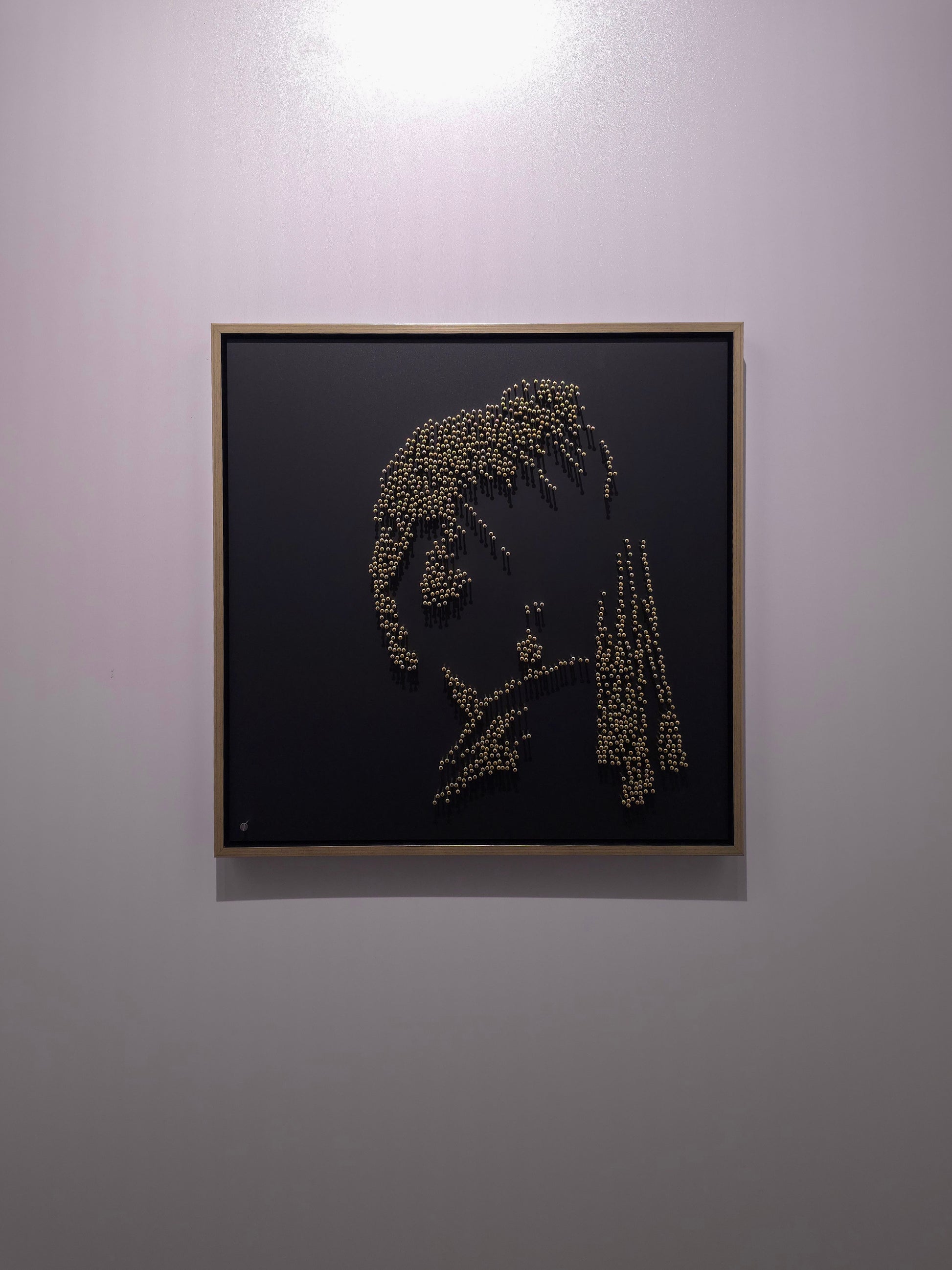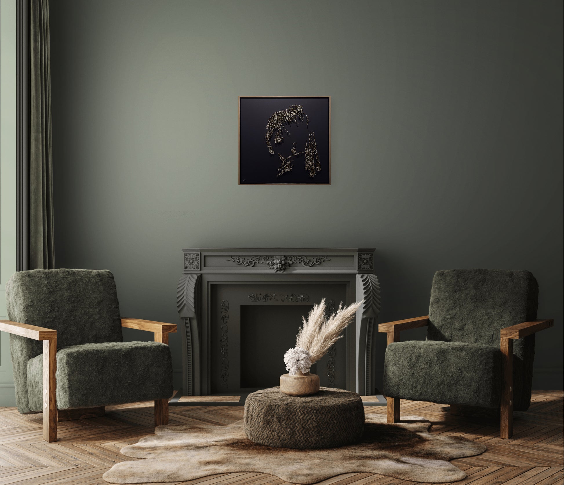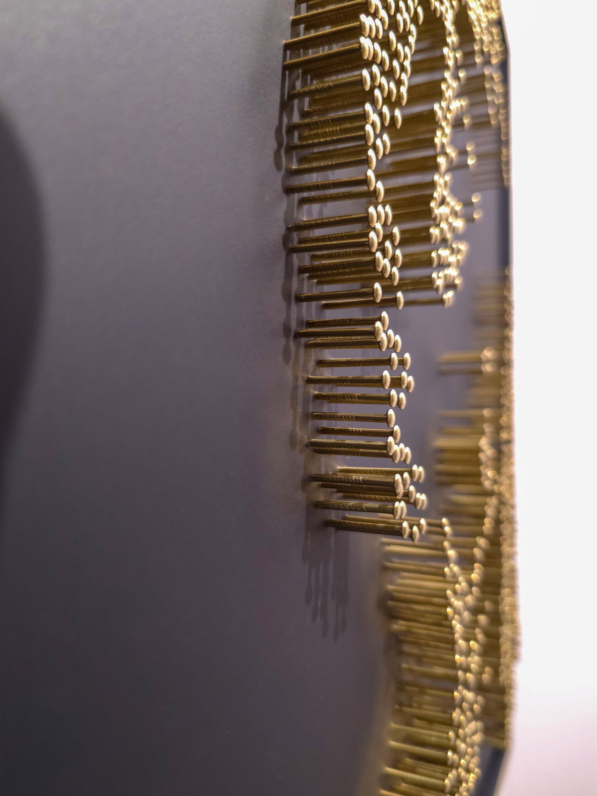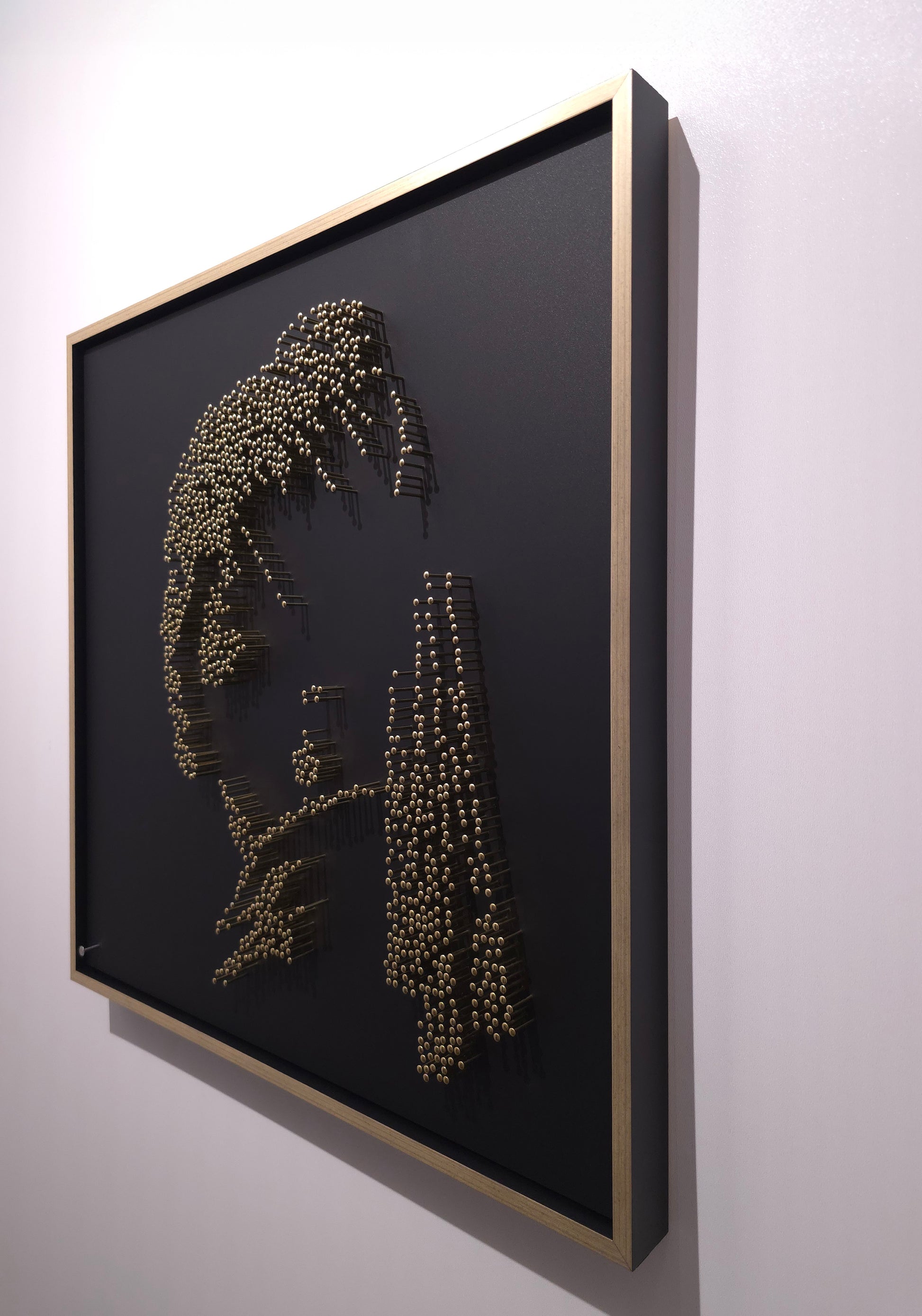 No paint, no print, no ink. Her gaze emerges from darkness, formed entirely by reflections of solid brass on matte black acrylic glass. From afar her presence feels calm and eternal. Up close the work dissolves into pure abstraction, each nail a point of light shaping the illusion of form and depth.