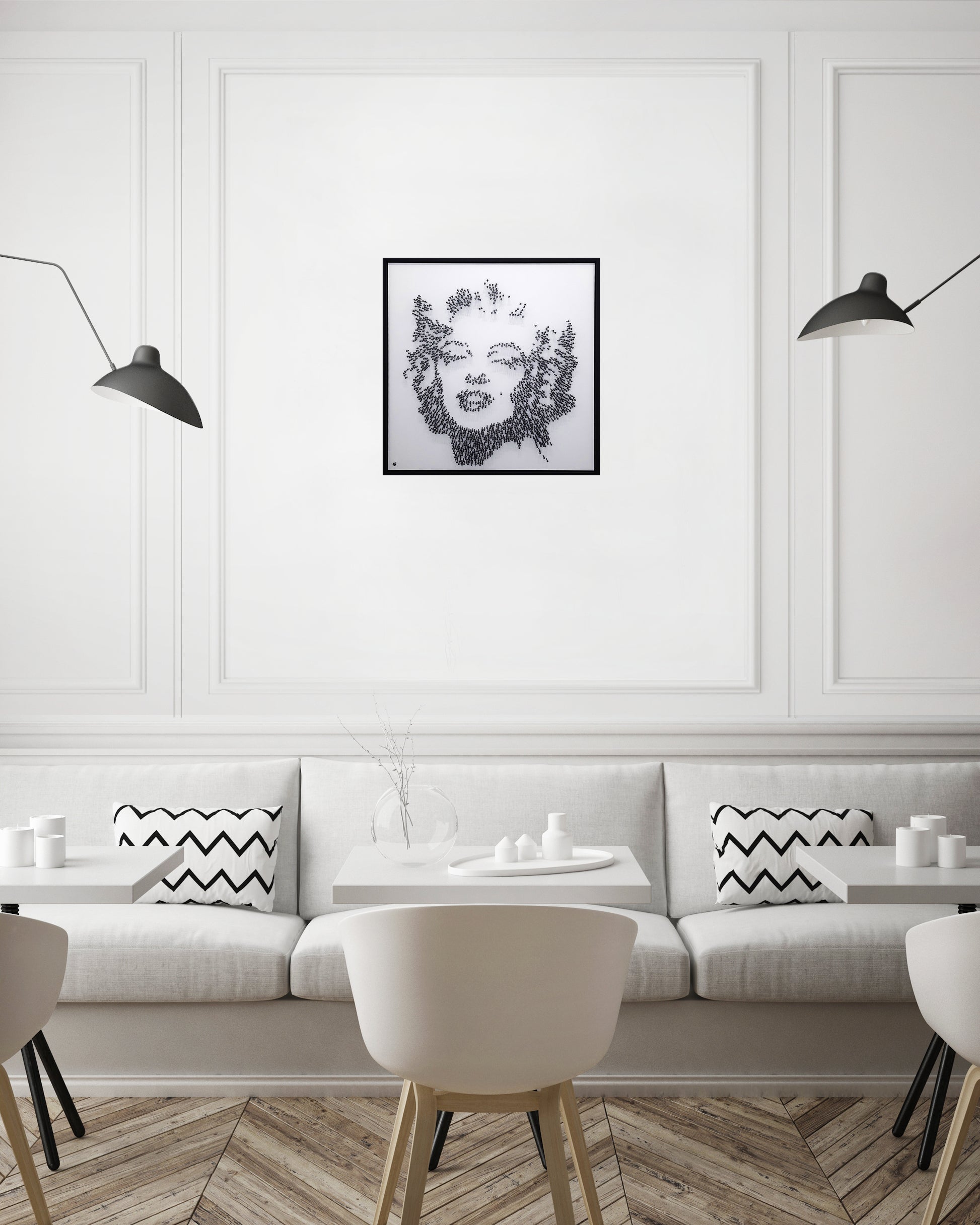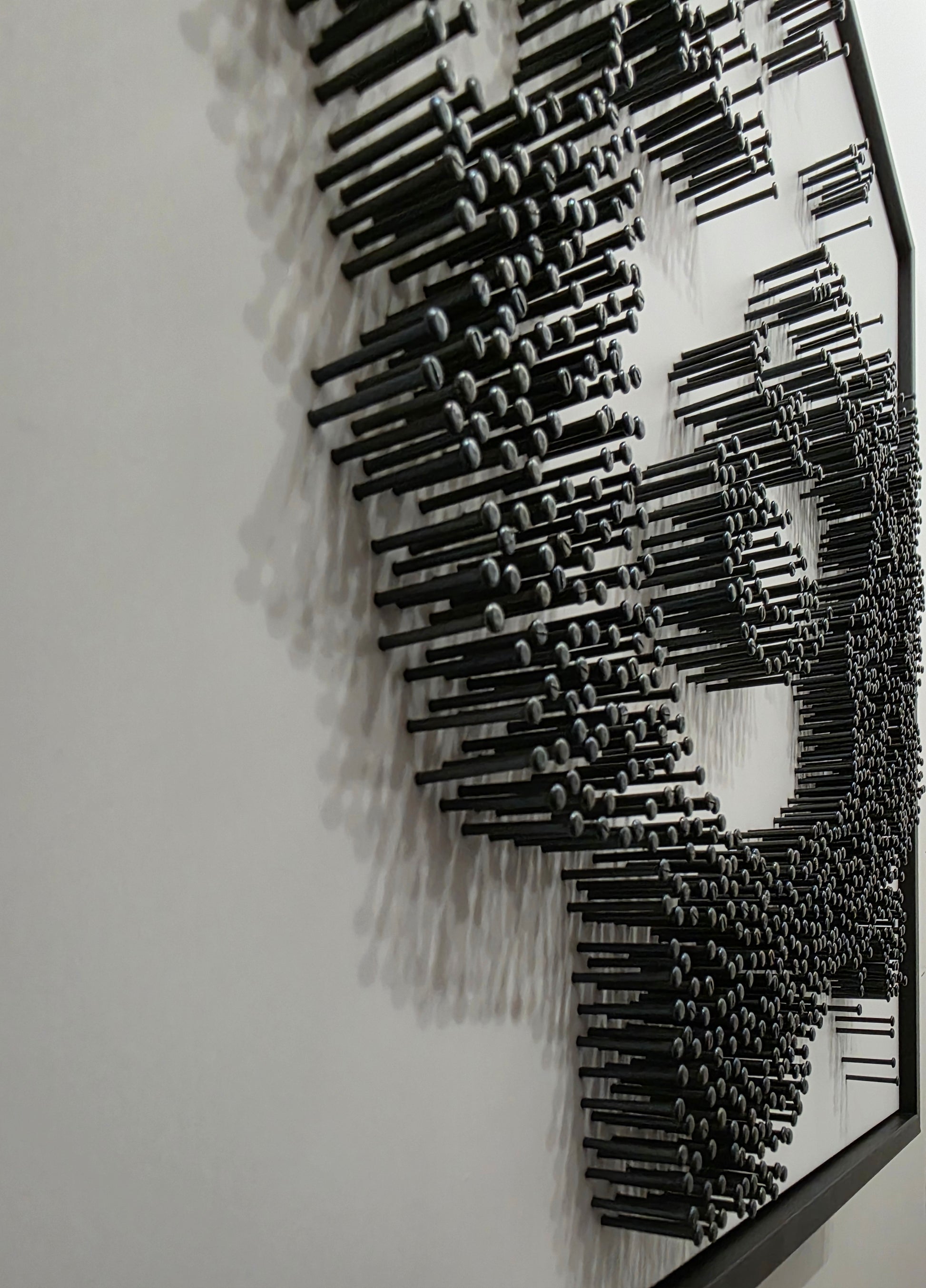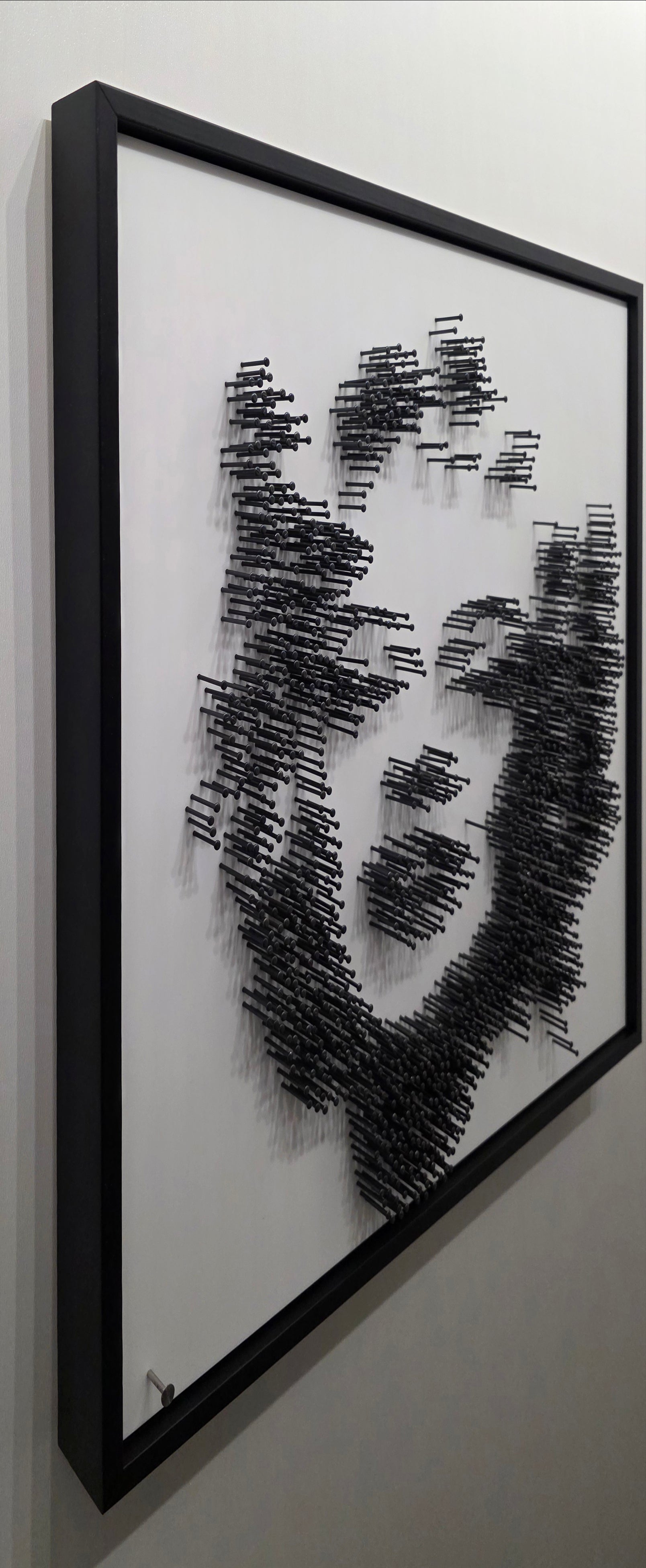 No paint, no print, no ink. Her face emerges purely through structure, shadow and rhythm. From a distance Marilyn is instantly recognizable, her features luminous and iconic. Up close the work dissolves into pure abstraction, each blackened steel nail forming part of a sculptural whole.