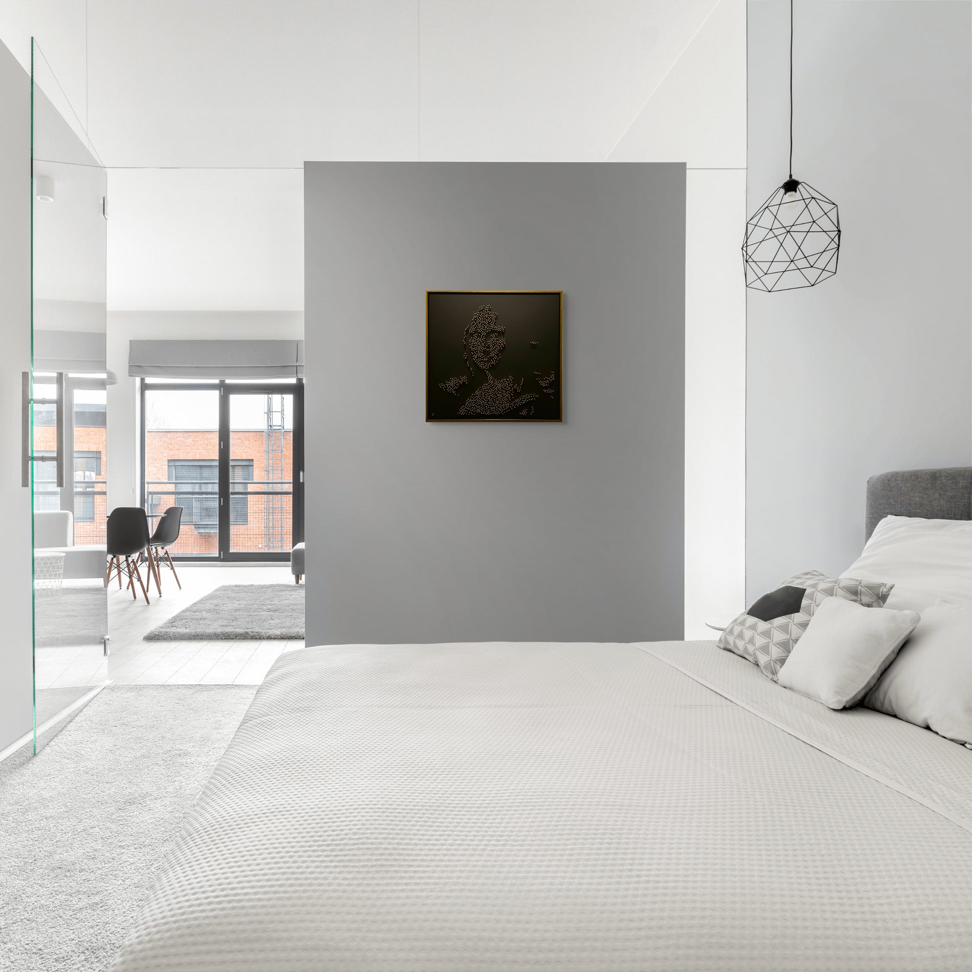 No paint, ink, or print, the world’s most famous portrait emerges purely through structure, shadow, and shine. From a distance, the figure is instantly recognizable. Up close, it dissolves into a golden rhythm, each nail reflecting light against a deep matte black acrylic background.