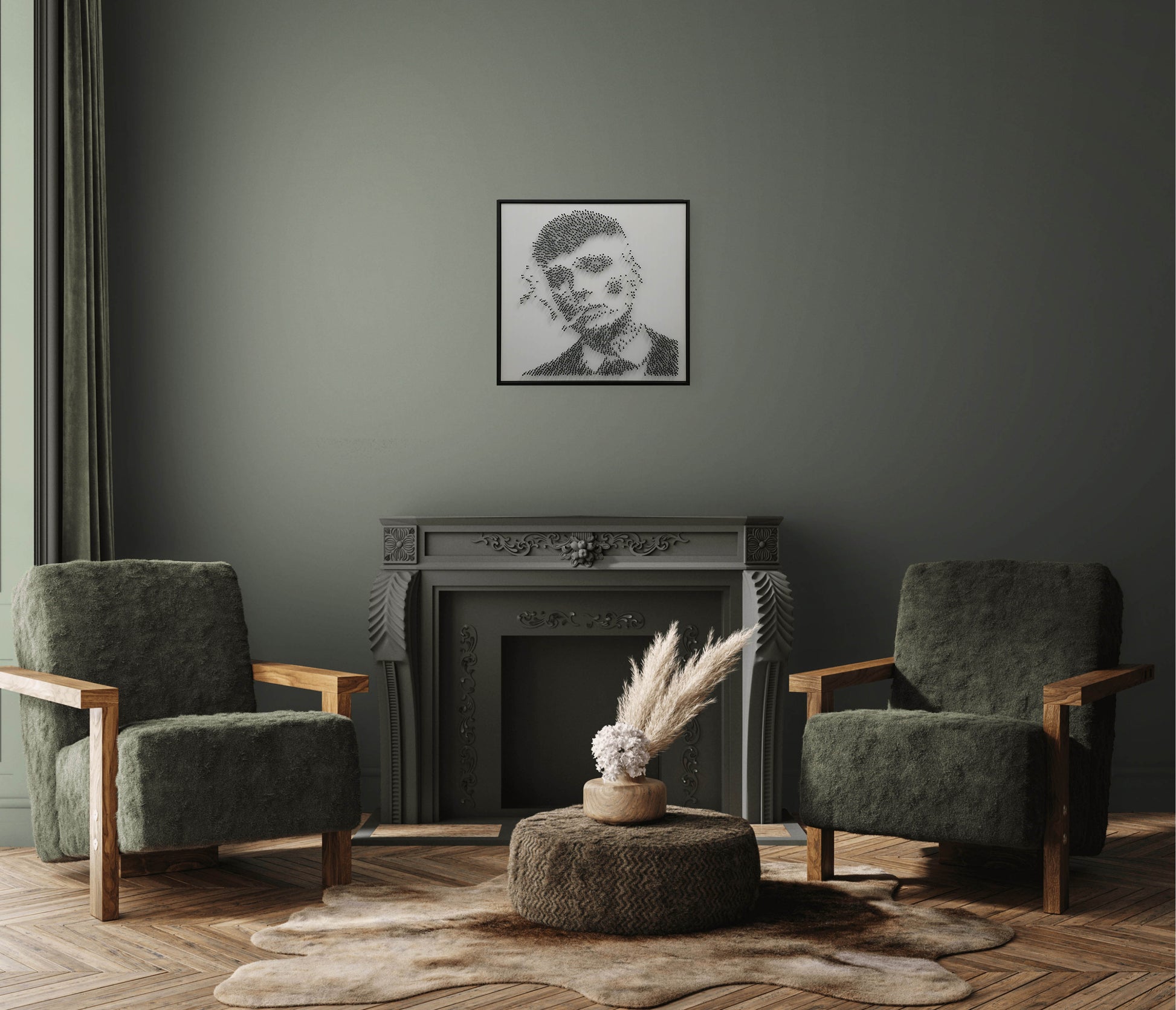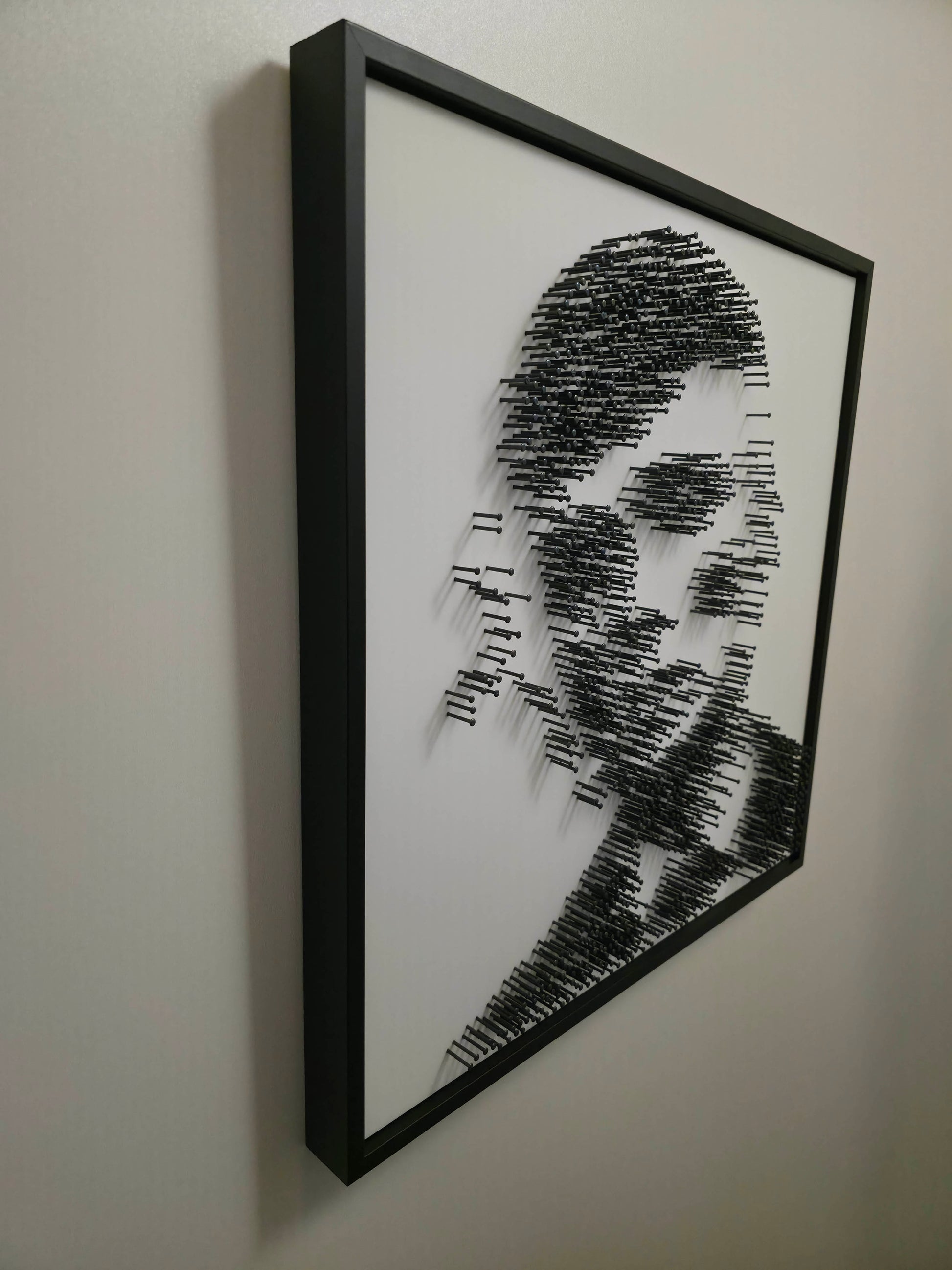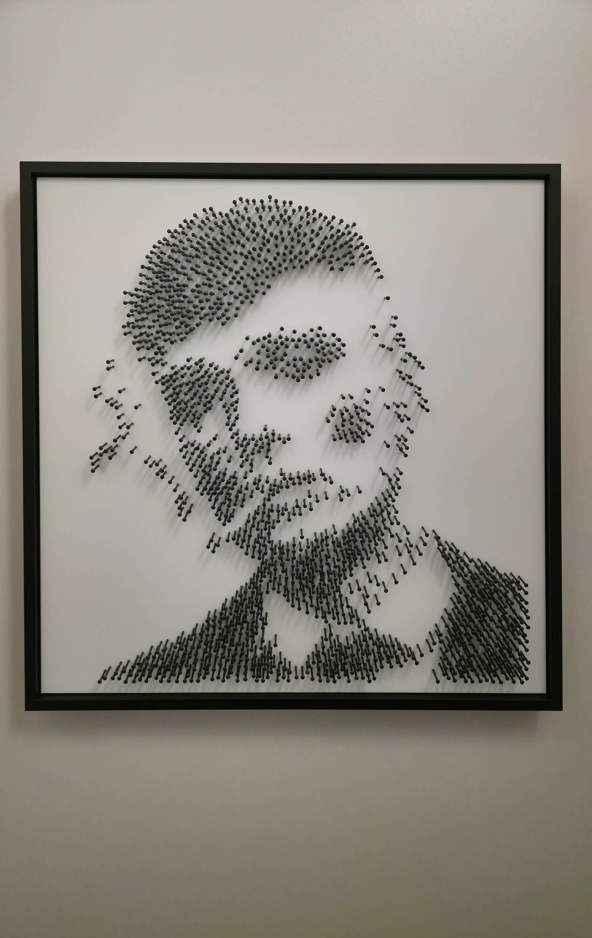This portrait of Tommy Shelby captures more than a face. From a distance, his gaze commands the frame. Up close, the illusion fractures into rhythm — a raw structure of steel, shadow, and precision. No brushstrokes. No paint. Just nails and intent.