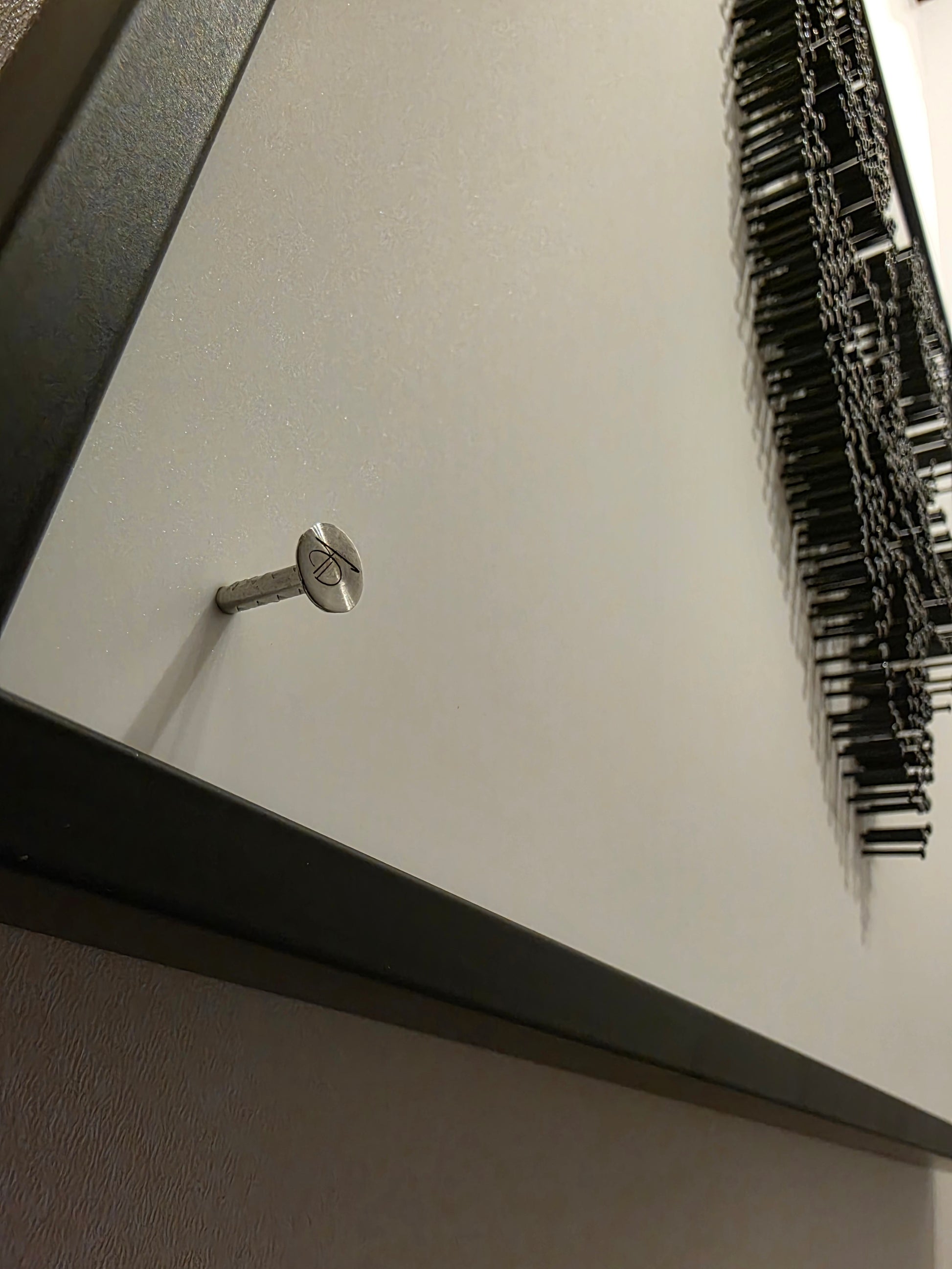 No paint, ink, or print, the mask emerges purely through structure, shadow, and rhythm. From a distance, the figure is instantly recognizable. Up close, it dissolves into a sharp contrast, each blackened steel nail standing out against the luminous white acrylic background.